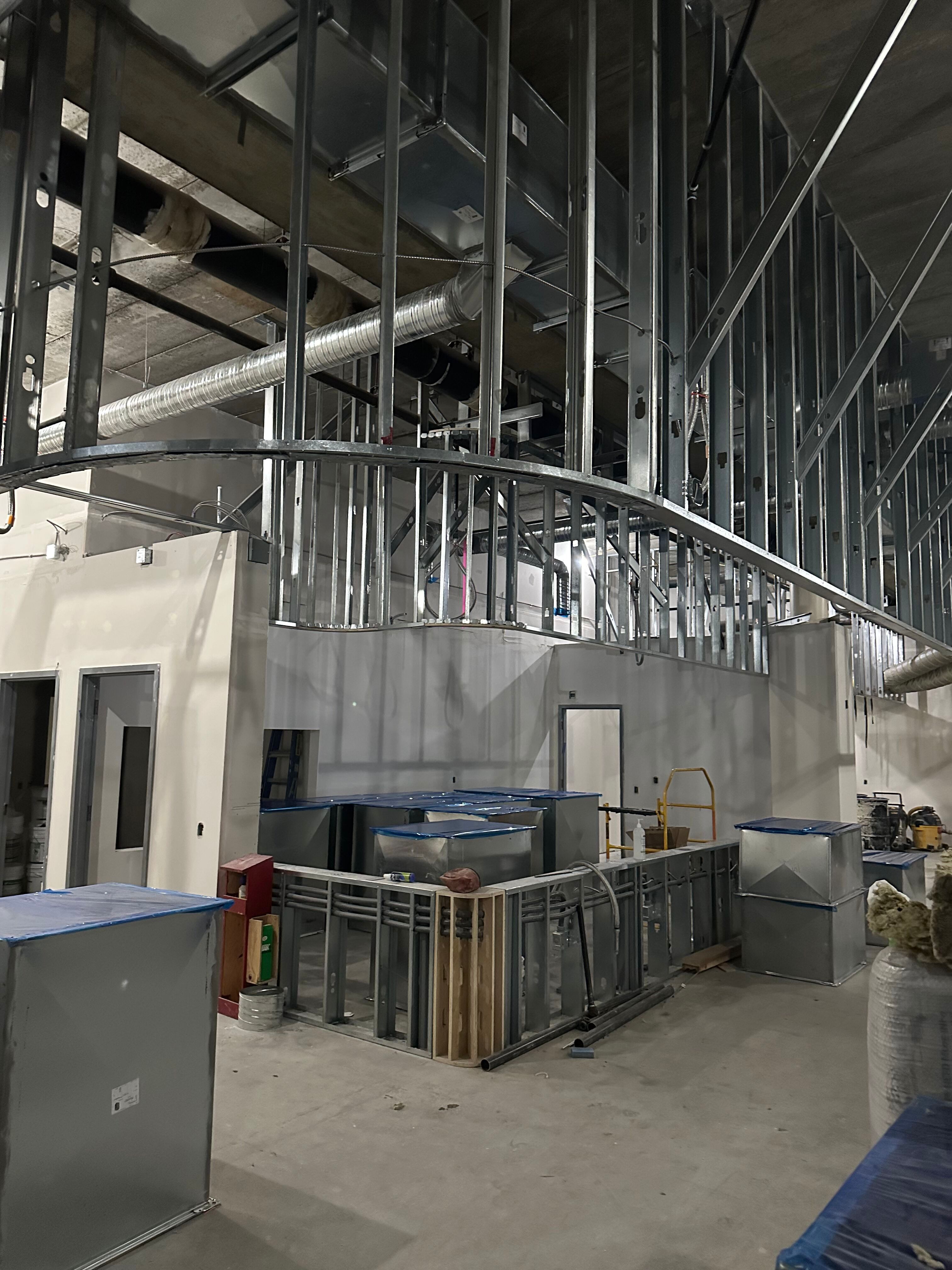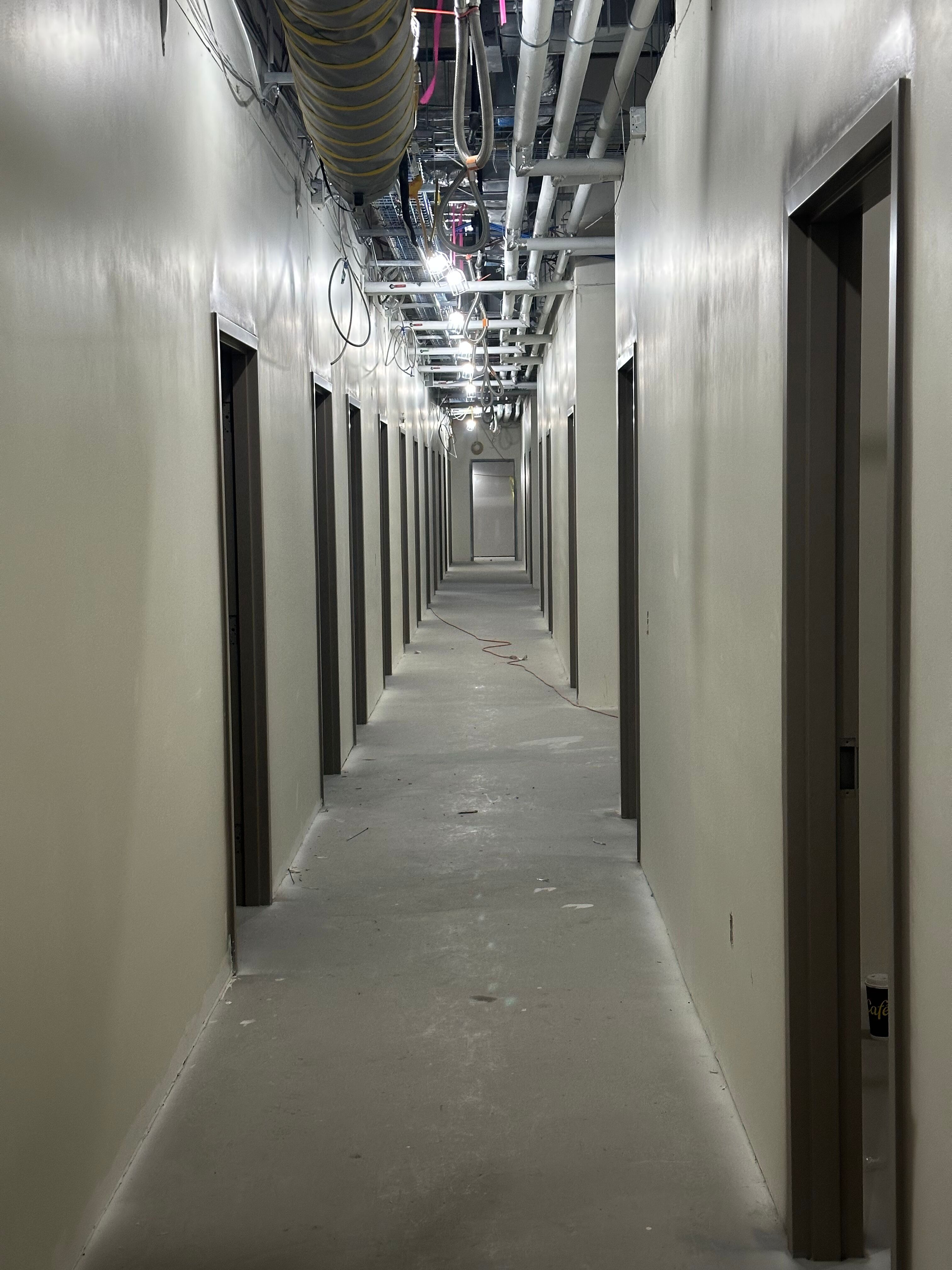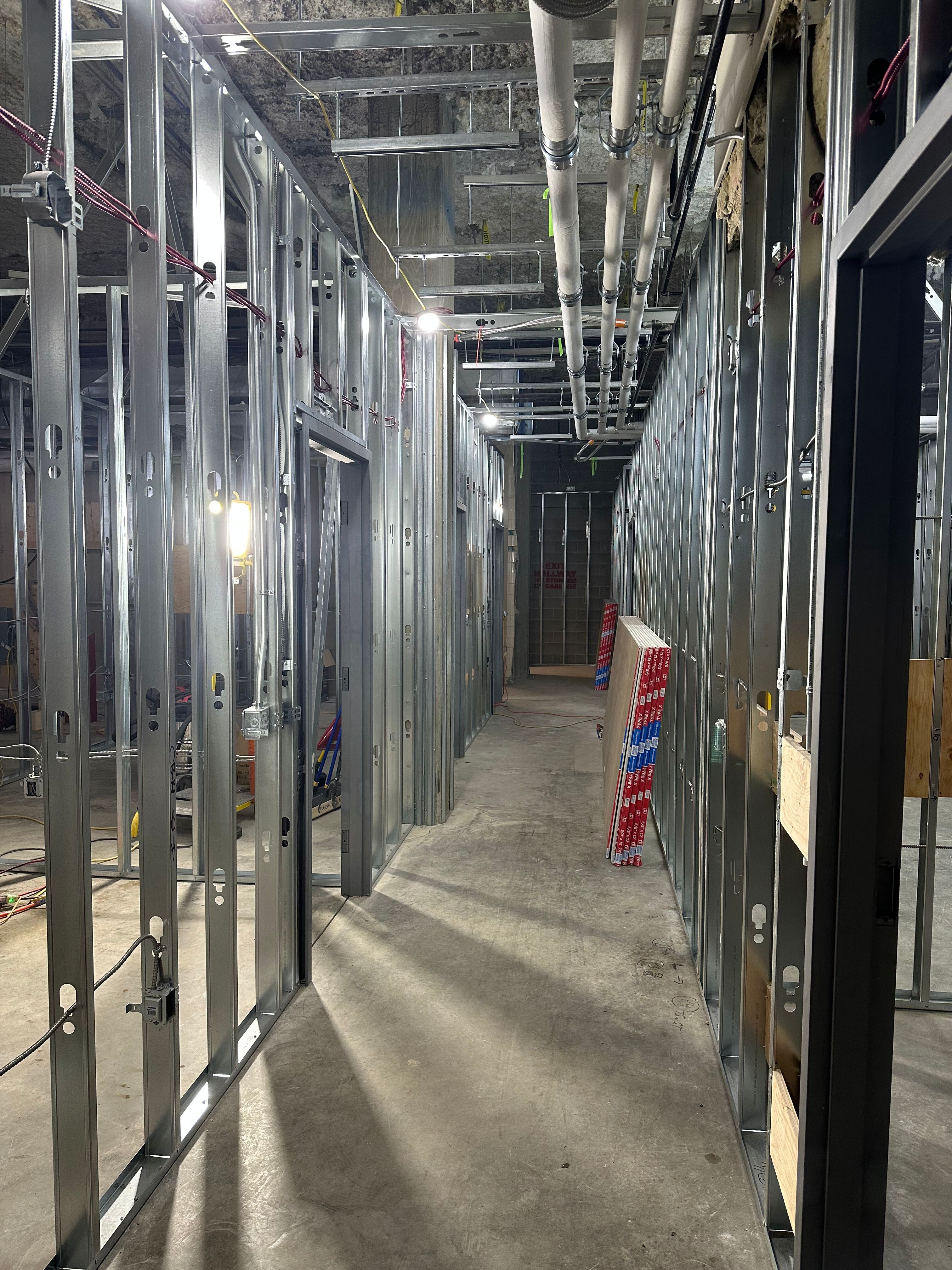 Drywalled corridors taking shape in the future space, with clinical and office rooms progressing on both sides.
